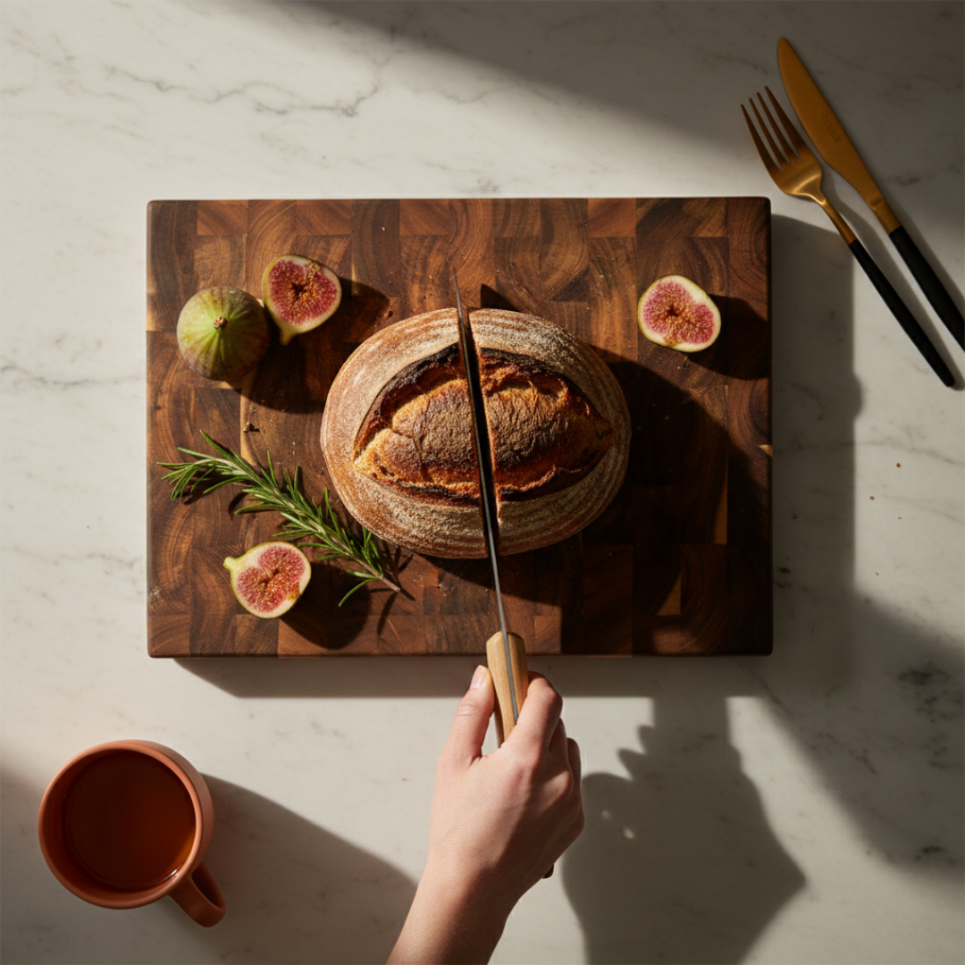 Fini les planches qui glissent pendant la découpe ! Notre planche en acacia dispose de pieds antidérapants sur les deux faces pour une stabilité parfaite sur tous types de plans de travail (granit, inox, bois, stratifié).